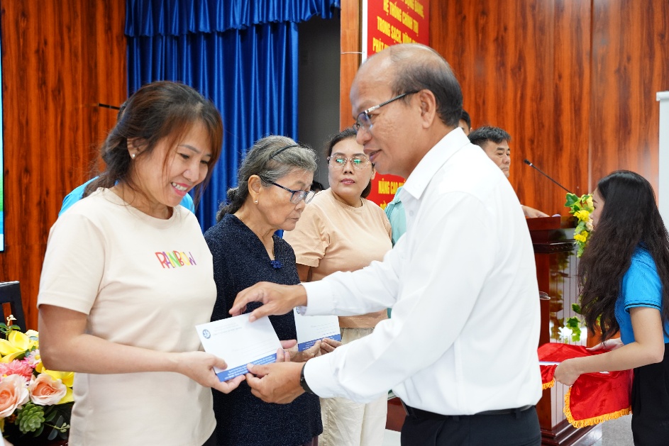Ông Dương Hồng Nhân – Bí thư Đảng ủy, Chủ tịch HĐTV Tổng Công ty Cấp nước Sài Gòn (SAWACO) trao nhu yếu phẩm cho các hộ gia đình khó khăn tại “Chương trình tuyên truyền hạn chế khai thác và sử dụng nước ngầm vì sức khỏe cộng đồng và chung tay xây dựng phường Bình Hưng Hòa xanh” do Công ty Cổ phần Cấp nước Chợ Lớn phối hợp địa phương tổ chức.