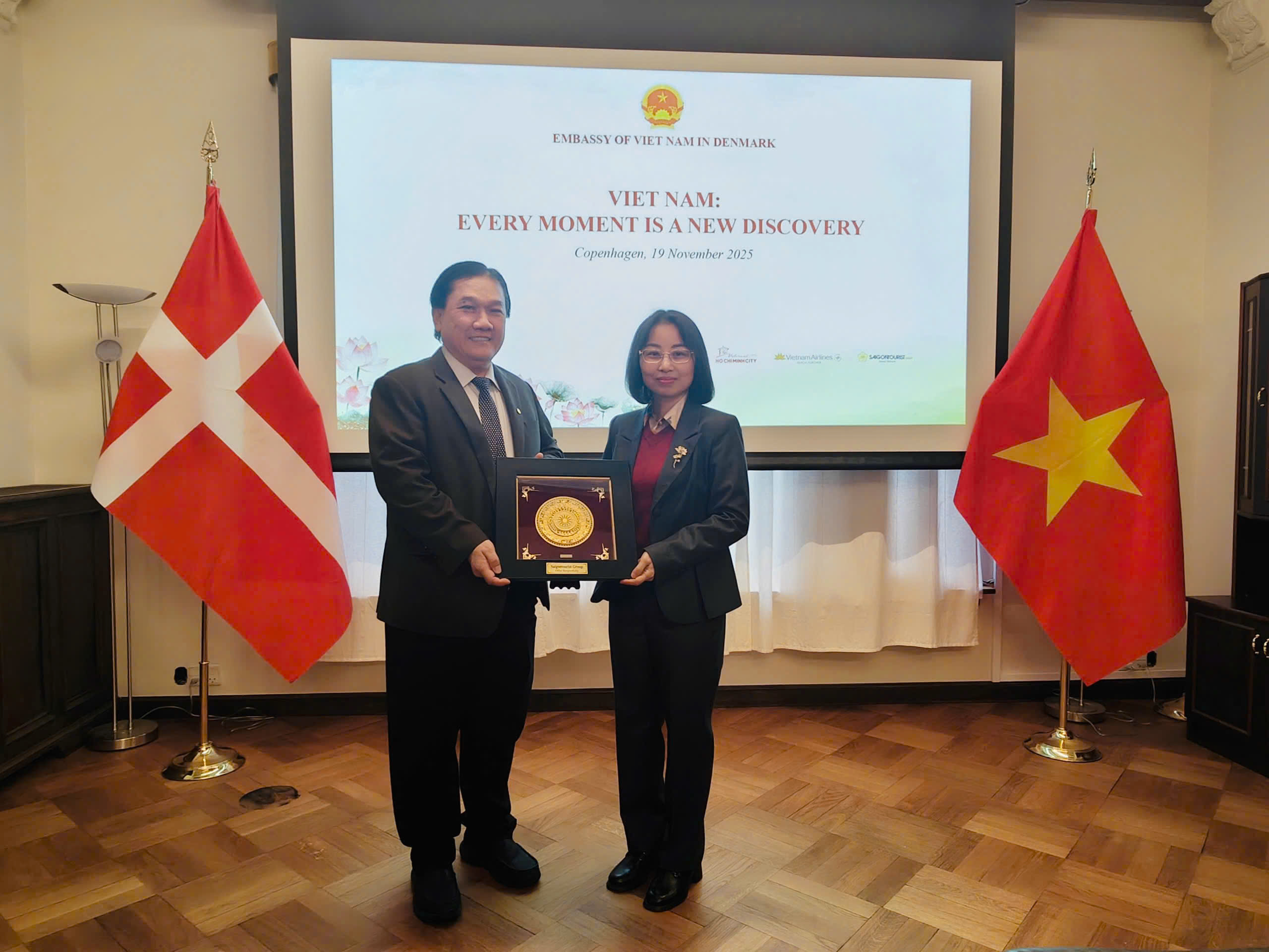 Ông Trương Đức Hùng - Tổng Giám đốc Saigontourist Group trao quà lưu niệm đến Đại sứ đặc mệnh toàn quyền nước CHXHCN Việt Nam tại Đan Mạch Nguyễn Lê Thanh