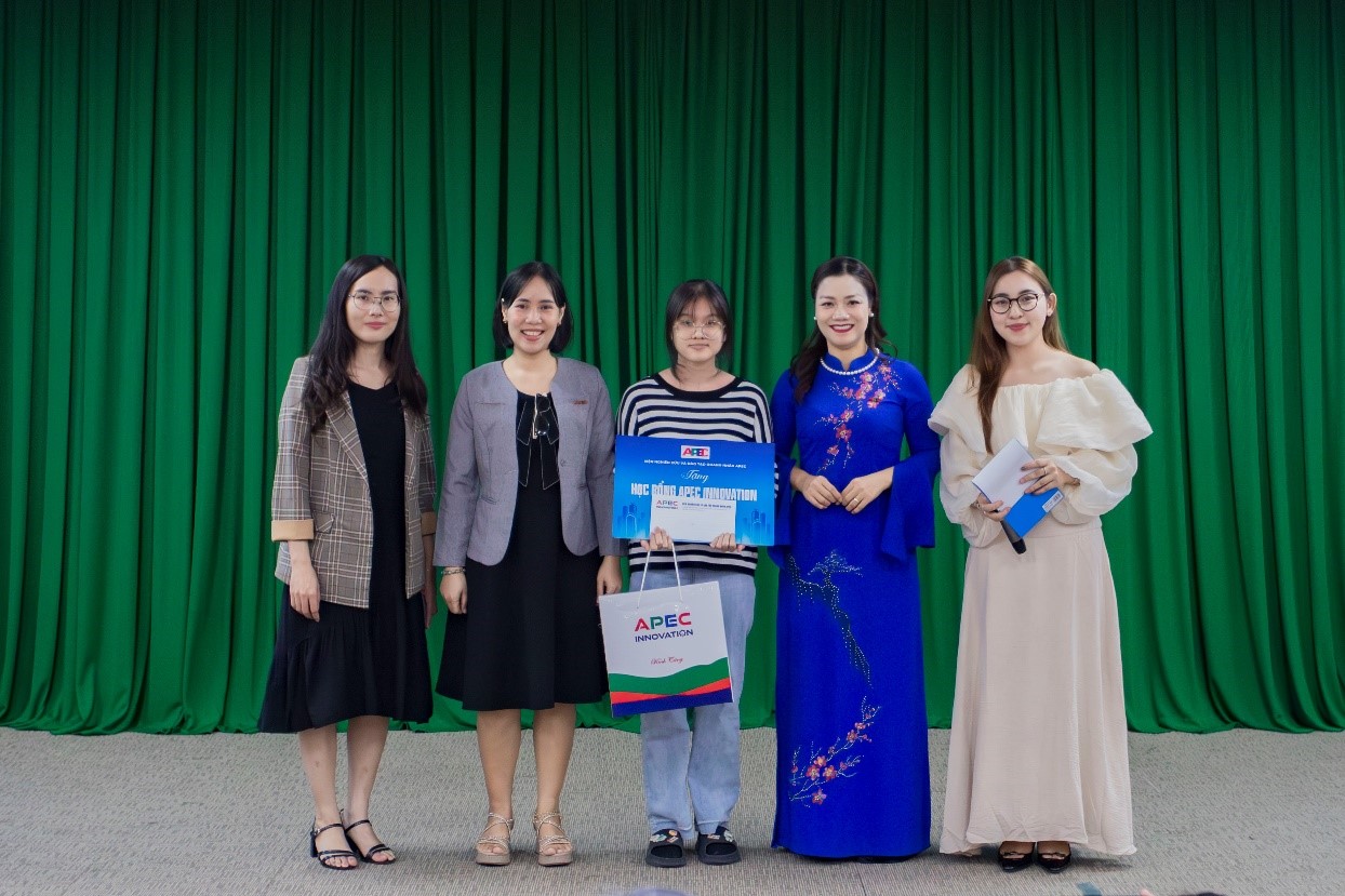 Ths. Nguyễn Thị Bích Hồng và đại diện cuộc thi APEC Inovation trao tặng học bổng trị giá 3.000.000 đồng cho sinh viên Võ Ngọc Quốc Hân, với tinh thần vượt khó trong học tập, có nghị lực trong cuộc sống .