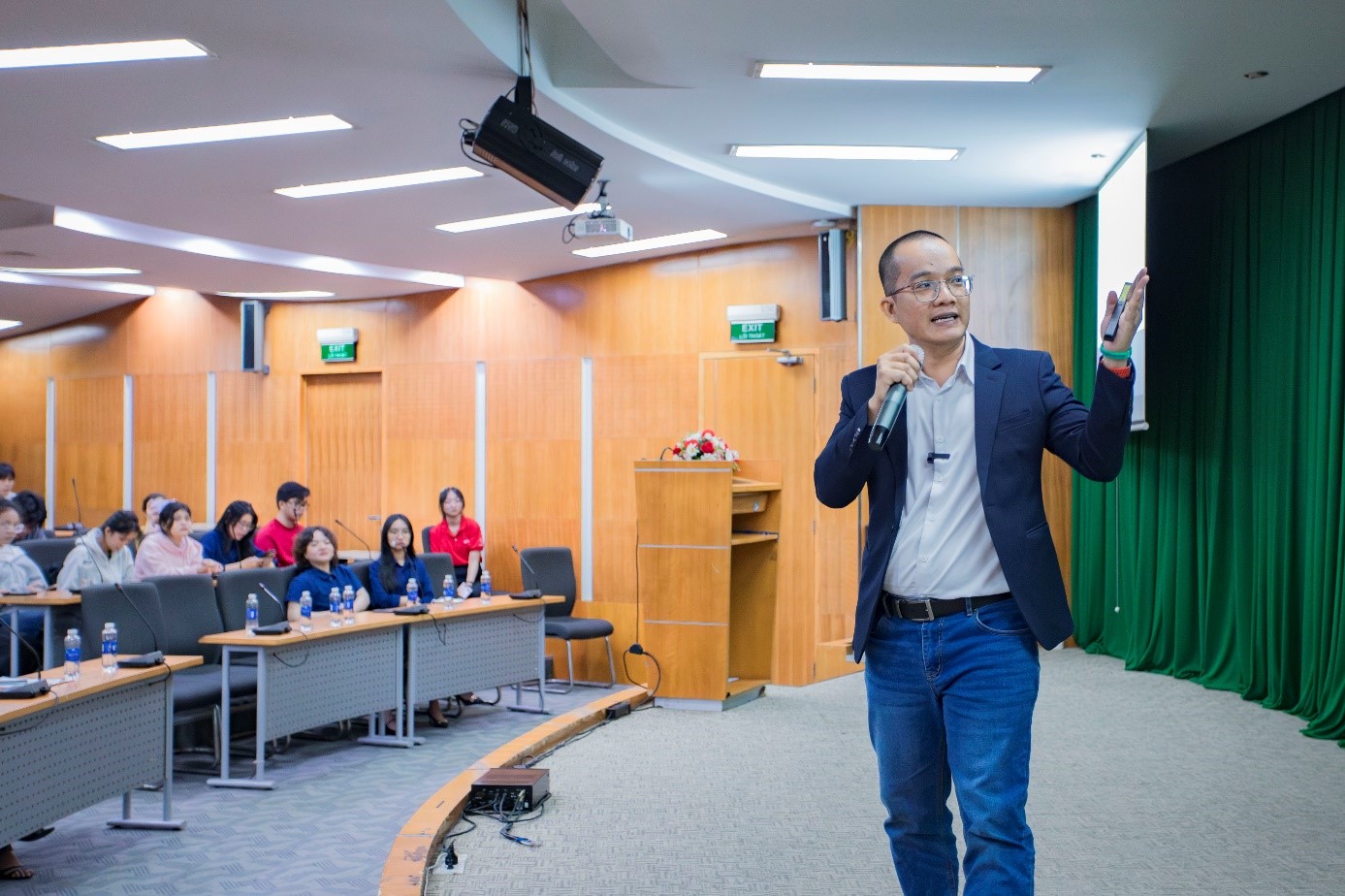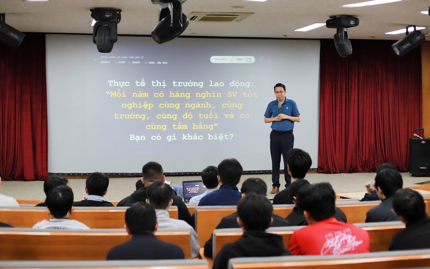 Chuyên gia Đỗ Quang Yên thuyết giảng sinh động trước sinh viên về những trải nghiệm, xu thế chuyển đổi số của ngành công nghệ thông tin mà một trong những điểm nhấn quan trọng là trí tuệ nhân tạo AI.