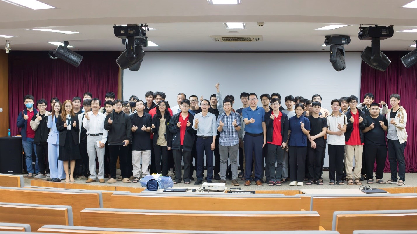 Đại diện trường Cao đẳng Sài Gòn và công ty SULECO cùng các sinh viên tham dự hân hoan, vui mừng chụp ảnh lưu niệm cùng hai diễn giả khi kết thúc chương trình.