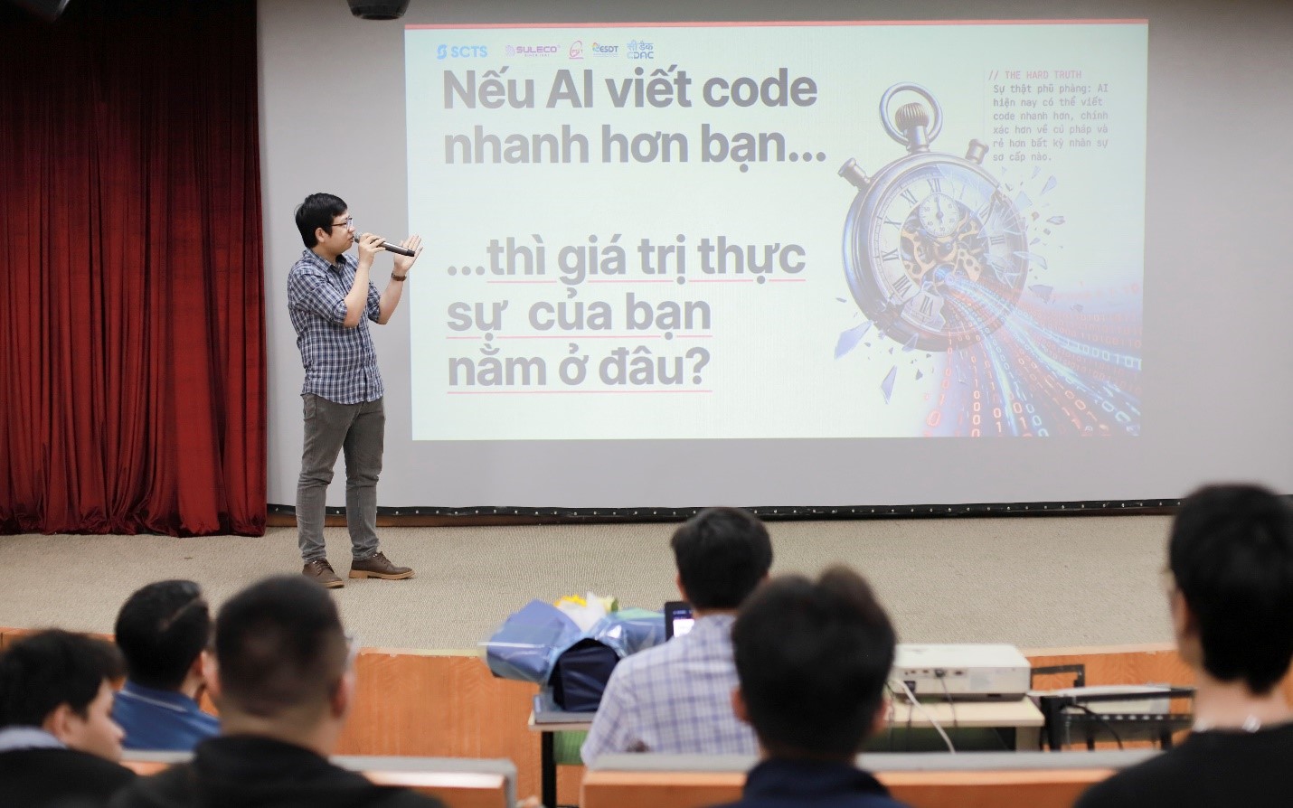Bằng tất cả tâm huyết của những chuyên gia có kiến thức sâu rộng và nhiều trải nghiệm, hai diễn giả đã nhiệt tình chia sẻ với các em sinh viên về vai trò, vị trí và lợi ích của công nghệ thông tin- trí tuệ nhân tạo (AI) đối với công việc và cuộc sống hiện nay; về thái độ và cách làm của những nhân viên đang hoạt động trong lĩnh vực này. Bằng kinh nghiệm thực tiễn phong phú, diễn giả thể hiện sự thấu cảm và am tường trong ngành công nghệ thông tin khi giảng giải dẫn dắt các bạn trẻ đi vào những vấn đề cơ bản và xoáy sâu vào những ngóc ngách của các ứng dụng, thực hành, thẩm định, đánh giá kết quả sử dụng AI thông qua tư duy phản biện và sáng tạo. AI không thay được con người nhưng con người biết sử dụng AI sẽ thay thế nhiều người để xử lý công việc nhanh và hiệu quả cao hơn hẳn.