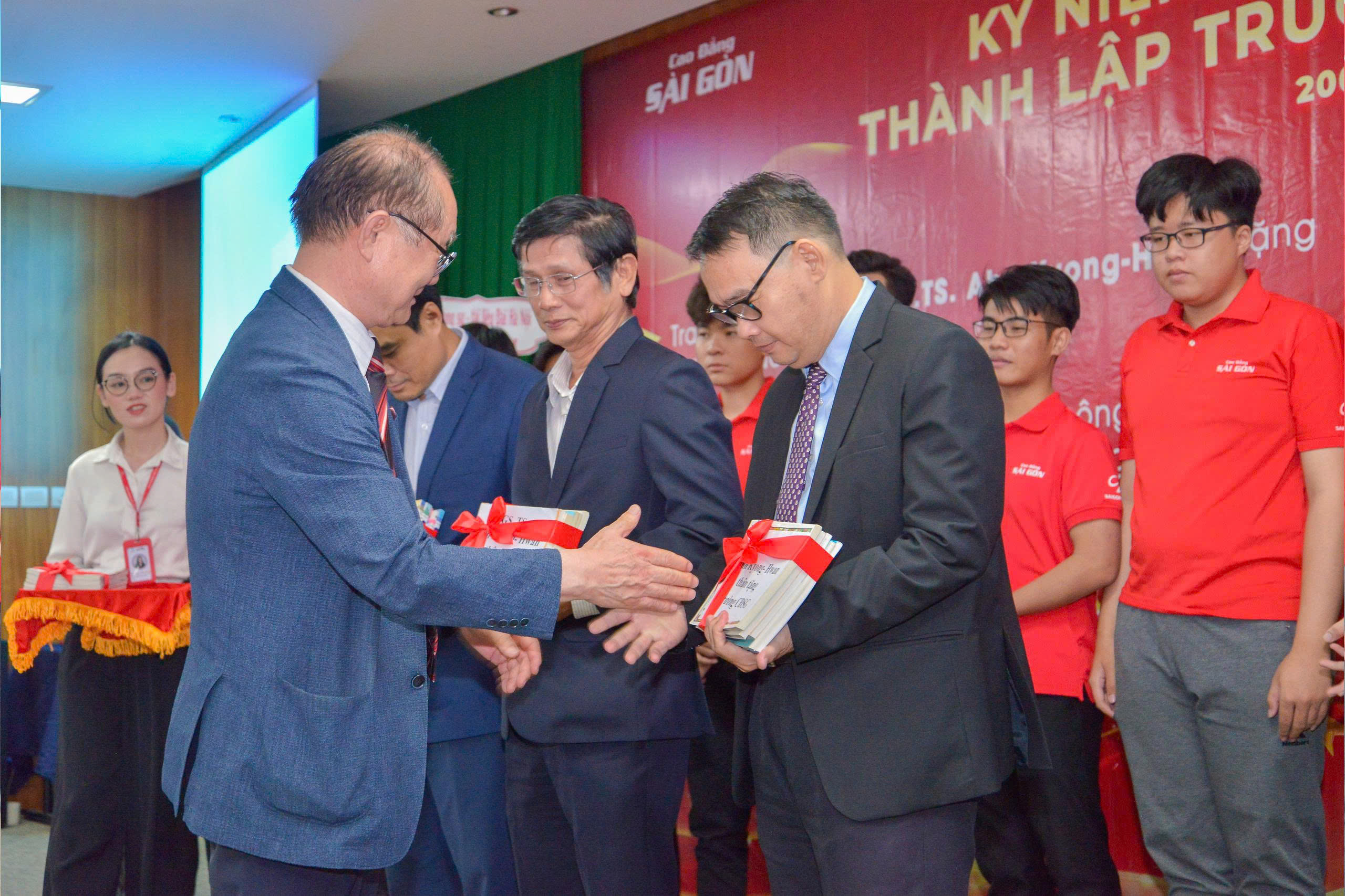 Thạc sĩ Đỗ Hữu Khoa, Tổng Thư Ký hội đồng Khoa học và Chiến lược – Thành viên Ban điều hành Trường Cao đẳng Sài Gòn nhận sách tặng từ Gs Ahn