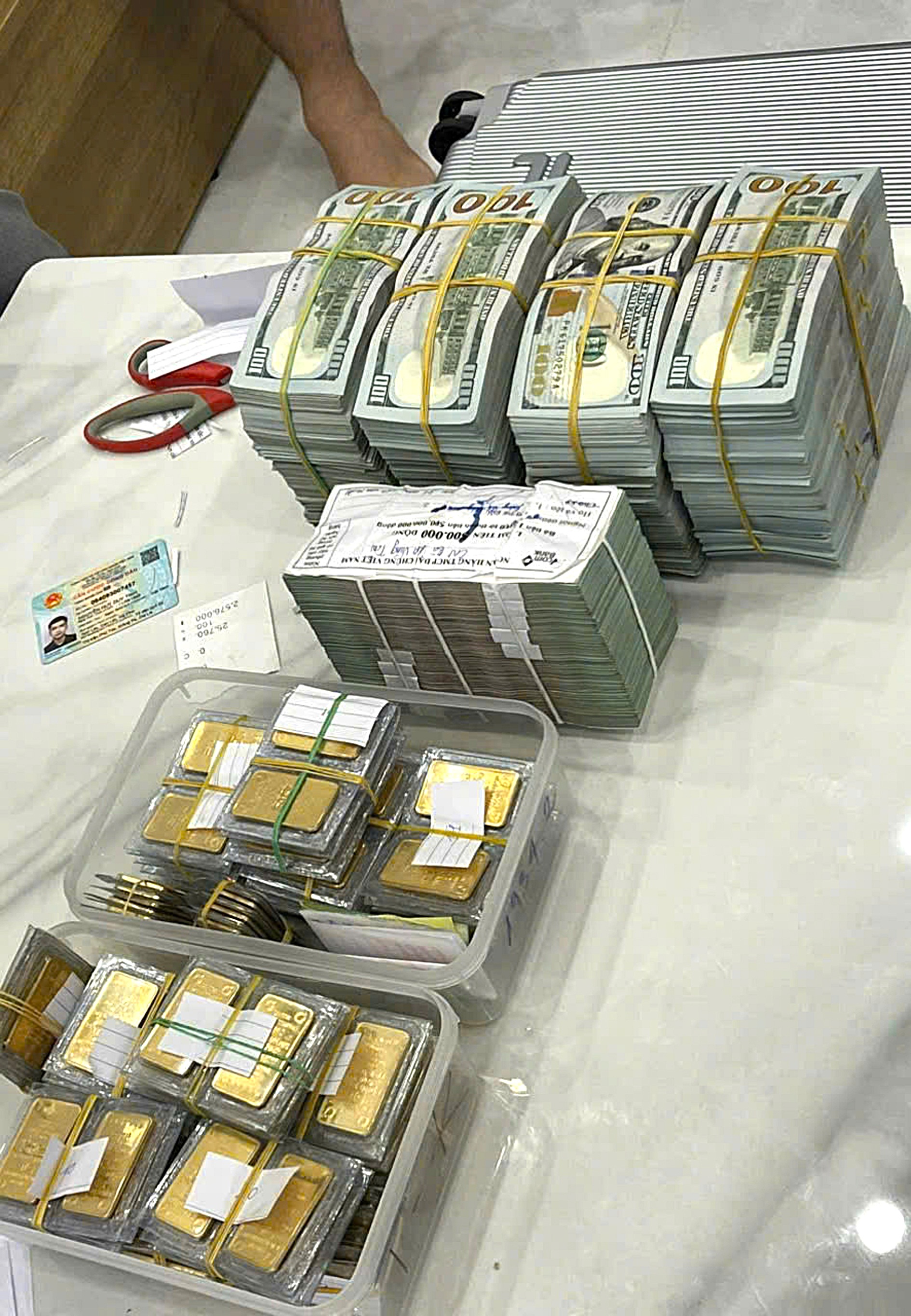 Một phần số tiền, vàng bị công an thu giữ - Ảnh: CACC