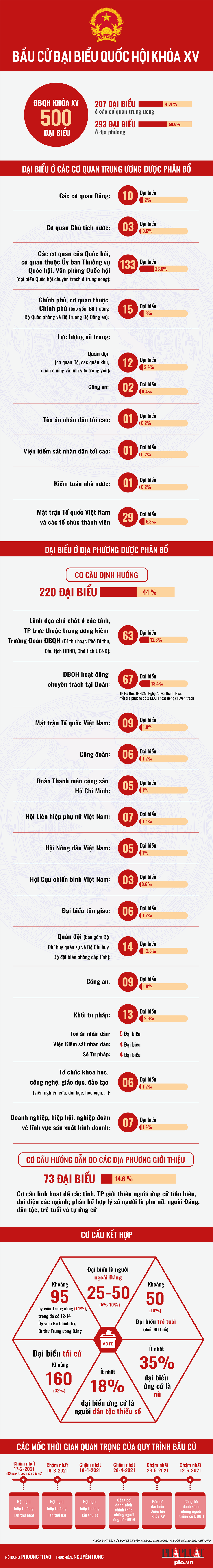(PLO)- Dự kiến trong 500 đại biểu Quốc hội khóa XV sẽ có 207 đại biểu ở các cơ quan trung ương và 293 đại biểu ở địa phương. Có khoảng 95 đại biểu là Ủy viên Ban Chấp hành Trung ương; trong đó có 12-14 Ủy viên Bộ Chính trị, Bí thư Trung ương Đảng.